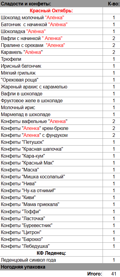 Шоколад молочный "Алёнка" (1 шт), Батончик  с начинкой "Алёнка" (1 шт), Шоколадка "Алёнка" (1 шт), Вафли с начинкой " Аленка" (2 шт), Пралине с орехами  "Аленка" (2 шт), Карамель "Алёнка" (2 шт), Трюфели (1 шт), Ирисный батончик (1 шт), Мягкий грильяж (1 шт), "Ореховая роща" (1 шт), Жареный арахис с карамелью (1 шт), Вафли в шоколаде (1 шт), Фруктовое желе в шоколаде (1 шт), Молочный ирис (1 шт), Мармелад в шоколаде (1 шт), Леденцовый символ года (1 шт)