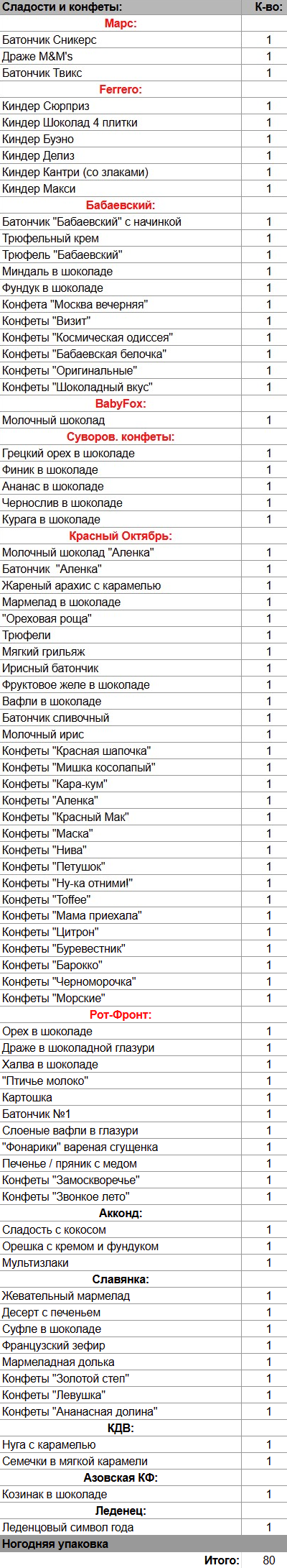 Батончик Сникерс (1 шт), Драже M&M's (1 шт), Батончик Твикс (1 шт), Киндер Сюрприз (1 шт), Киндер Шоколад 4 плитки (1 шт), Киндер Буэно (1 шт), Киндер Делиз (1 шт), Киндер Кантри (со злаками) (1 шт), Киндер Макси (1 шт), Батончик "Бабаевский" с начинкой (1 шт), Трюфельный крем (1 шт), Трюфель "Бабаевский" (1 шт), Миндаль в шоколаде (1 шт), Фундук в шоколаде (1 шт), Молочный шоколад (1 шт), Грецкий орех в шоколаде (1 шт), Финик в шоколаде (1 шт), Ананас в шоколаде (1 шт), Чернослив в шоколаде (1 шт), Курага в шоколаде (1 шт), Молочный шоколад "Аленка" (1 шт), Батончик "Аленка" (1 шт), Жареный арахис с карамелью (1 шт), Мармелад в шоколаде (1 шт), "Ореховая роща" (1 шт), Трюфели (1 шт), Мягкий грильяж (1 шт), Ирисный батончик (1 шт), Фруктовое желе в шоколаде (1 шт), Вафли в шоколаде (1 шт), Батончик сливочный (1 шт), Молочный ирис (1 шт), Орех в шоколаде (1 шт), Драже в шоколадной глазури (1 шт), Халва в шоколаде (1 шт), "Птичье молоко" (1 шт), Картошка (1 шт), Батончик №1 (1 шт), Слоеные вафли в глазури (1 шт), "Фонарики" вареная сгущенка (1 шт), Печенье / пряник с медом (1 шт), Сладость с кокосом (1 шт), Орешка с кремом и фундуком (1 шт), Мультизлаки (1 шт), Жевательный мармелад (1 шт), Десерт с печеньем (1 шт), Суфле в шоколаде (1 шт), Французский зефир (1 шт), Мармеладная долька (1 шт), Нуга с карамелью (1 шт), Семечки в мягкой карамели (1 шт), Козинак в шоколаде (1 шт), Леденцовый символ года (1 шт)