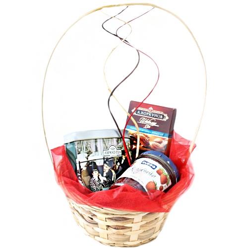 Состав: корзина, шоколад Коркунов, чай Ахмад ти Эрл Грей, конфитюр клубничный, декор
