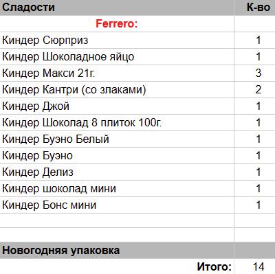 Киндер Шоколадное яйцо (1 шт), Киндер Шоколад 8 плиток 50 гр. (1 шт), Киндер Делиз (1 шт), Киндер Сюрприз (1 шт), Киндер Кантри (со злаками) (2 шт), Киндер Макси 21 гр. (3 шт), Киндер Буено (1 шт), Киндер Буено Белый (1 шт), Киндер Шоколад мини (1 шт), Киндер Буэно мини (1 шт), Киндер Джой (1 шт)
