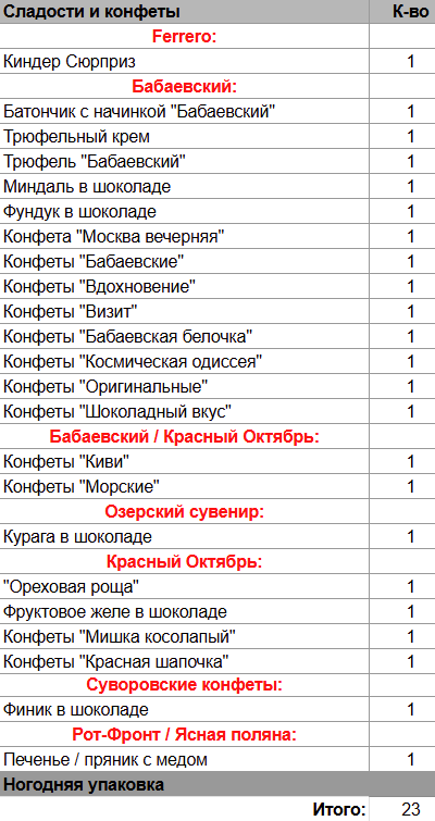 Киндер Сюрприз (1 шт), Батончик с начинкой "Бабаевский" (1 шт), Трюфельный крем (1 шт), Трюфель "Бабаевский" (1 шт), Миндаль в шоколаде (1 шт), Фундук в шоколаде (1 шт), Курага в шоколаде (1 шт), Финик в шоколаде (1 шт), "Ореховая роща" (1 шт), Фруктовое желе в шоколаде (1 шт), Печенье / пряник с медом (1 шт)