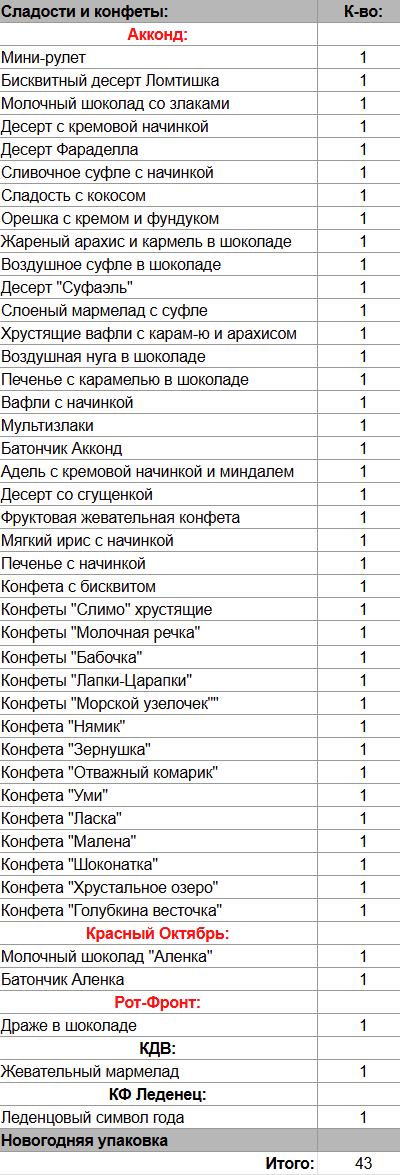 Кол-во сладостей: 43 шт.