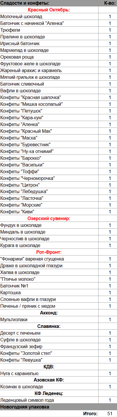 Молочный шоколад (1 шт), Батончик с начинкой "Аленка" (1 шт), Трюфели (1 шт), Пралине в шоколаде (1 шт), Ирисный батончик (1 шт), Мармелад в шоколаде (1 шт), Ореховая роща (1 шт), Фруктовое желе в шоколаде (1 шт), Жареный арахис и карамель (1 шт), Мягкий грильяж в шоколаде (1 шт), Батончик сливочный (1 шт), Вафли в шоколаде (1 шт), Фундук в шоколаде (1 шт), Миндаль в шоколаде (1 шт), Чернослив в шоколаде (1 шт), Курага в шоколаде (1 шт), "Фонарики" вареная сгущенка (1 шт), Драже в шоколадной глазури (1 шт), Халва в шоколаде (1 шт), "Птичье молоко" (1 шт), Батончик №1 (1 шт), Картошка (1 шт), Слоеные вафли в глазури (1 шт), Печенье / пряник с медом (1 шт), Мультизлаки (1 шт), Десерт с печеньем (1 шт), Суфле в шоколаде (1 шт), Французский зефир (1 шт), Нуга с карамелью (1 шт), Козинак в шоколаде (1 шт), Леденцовый символ года (1 шт)