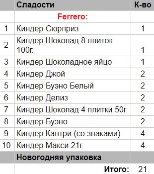 Киндер Шоколад 4 плитки 50 гр. (2 шт), Киндер Делиз (2 шт), Киндер Сюрприз (1 шт), Киндер Кантри (со злаками) (4 шт), Киндер Макси 21 гр. (4 шт), Киндер Джой (2 шт), Киндер Шоколадное яйцо (1 шт), Киндер Шоколад 8 плиток 50 гр. (2 шт), Киндер Буено Белый (2 шт), Киндер Буено (2 шт)