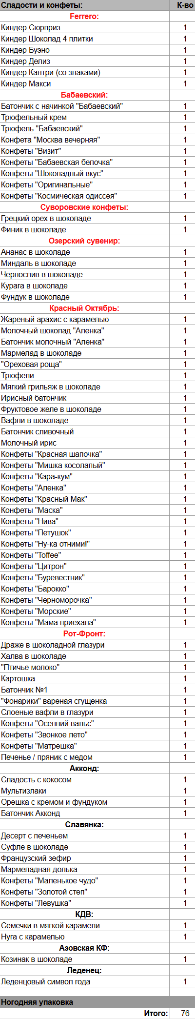 Киндер Сюрприз (1 шт), Киндер Шоколад 4 плитки (1 шт), Киндер Буэно (1 шт), Киндер Делиз (1 шт), Киндер Кантри (со злаками) (1 шт), Киндер Макси (1 шт), Батончик с начинкой "Бабаевский" (1 шт), Трюфельный крем (1 шт), Трюфель "Бабаевский" (1 шт), Грецкий орех в шоколаде (1 шт), Финик в шоколаде (1 шт), Ананас в шоколаде (1 шт), Миндаль в шоколаде (1 шт), Чернослив в шоколаде (1 шт), Курага в шоколаде (1 шт), Фундук в шоколаде (1 шт), Жареный арахис с карамелью (1 шт), Молочный шоколад "Аленка" (1 шт), Батончик молочный "Аленка" (1 шт), Мармелад в шоколаде (1 шт), "Ореховая роща" (1 шт), Трюфели (1 шт), Мягкий грильяж в шоколаде (1 шт), Ирисный батончик (1 шт), Фруктовое желе в шоколаде (1 шт), Вафли в шоколаде (1 шт), Батончик сливочный (1 шт), Молочный ирис (1 шт), Драже в шоколадной глазури (1 шт), Халва в шоколаде (1 шт), "Птичье молоко" (1 шт), Картошка (1 шт), Батончик №1 (1 шт), Слоеные вафли в глазури (1 шт), "Фонарики" вареная сгущенка (1 шт), Печенье / пряник с медом (1 шт), Сладость с кокосом (1 шт), Мультизлаки (1 шт), Орешка с кремом и фундуком (1 шт), Батончик Акконд (1 шт), Десерт с печеньем (1 шт), Суфле в шоколаде (1 шт), Французский зефир (1 шт), Мармеладная долька (1 шт), Семечки в мягкой карамели (1 шт), Нуга с карамелью (1 шт), Козинак в шоколаде (1 шт), Леденцовый символ года (1 шт)