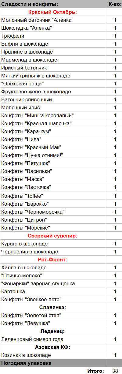 Молочный батончик "Аленка" (1 шт), Шоколадка "Аленка" (1 шт), Курага в шоколаде (1 шт), Чернослив в шоколаде (1 шт), Трюфели (1 шт), Вафли в шоколаде (1 шт), Пралине в шоколаде (1 шт), Мармелад в шоколаде (1 шт), Ирисный батончик (1 шт), Мягкий грильяж в шоколаде (1 шт), "Ореховая роща" (1 шт), Фруктовое желе в шоколаде (1 шт), Батончик сливочный (1 шт), Молочный ирис (1 шт), Халва в шоколаде (1 шт), "Птичье молоко" (1 шт), "Фонарики" вареная сгущенка (1 шт), Картошка (1 шт), Леденцовый символ года (1 шт), Козинак в шоколаде (1 шт)