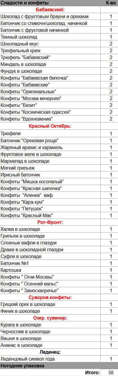 Кол-во сладостей: 58 шт.