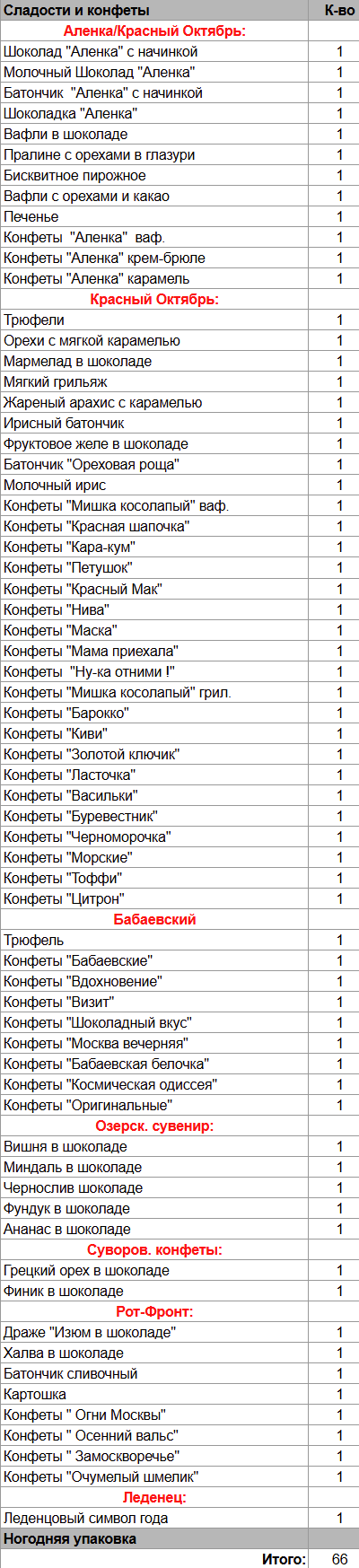 Шоколад "Аленка" с начинкой (1 шт), Молочный Шоколад "Аленка" (1 шт), Батончик "Аленка" с начинкой (1 шт), Шоколадка "Аленка" (1 шт), Вафли в шоколаде (1 шт), Пралине с орехами в глазури (1 шт), Бисквитное пирожное (1 шт), Вафли с орехами и какао (1 шт), Печенье (1 шт), Трюфели (1 шт), Орехи с мягкой карамелью (1 шт), Мармелад в шоколаде (1 шт), Мягкий грильяж (1 шт), Жареный арахис с карамелью (1 шт) ,Ирисный батончик (1 шт), Фруктовое желе в шоколаде (1 шт), Батончик "Ореховая роща" (1 шт), Молочный ирис (1 шт), Вишня в шоколаде (1 шт), Миндаль в шоколаде (1 шт), Чернослив шоколаде (1 шт), Фундук в шоколаде (1 шт), Ананас в шоколаде (1 шт), Грецкий орех в шоколаде (1 шт), Финик в шоколаде (1 шт), Трюфель (1 шт), Драже "Изюм в шоколаде" (1 шт), Халва в шоколаде (1 шт), Батончик сливочный (1 шт), Картошка (1 шт), Леденцовый символ года (1 шт)