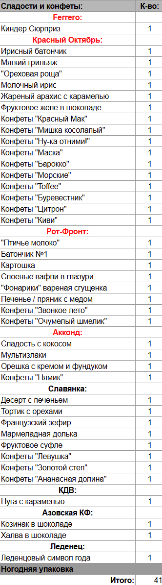 Киндер Сюрприз (1 шт), Ирисный батончик (1 шт), Мягкий грильяж (1 шт), "Ореховая роща" (1 шт), Молочный ирис (1 шт), Жареный арахис с карамелью (1 шт), Фруктовое желе в шоколаде (1 шт), "Птичье молоко" (1 шт), Батончик №1 (1 шт), Картошка (1 шт), Слоеные вафли в глазури (1 шт), "Фонарики" вареная сгущенка (1 шт), Печенье / пряник с медом (1 шт), Сладость с кокосом (1 шт), Мультизлаки (1 шт), Орешка с кремом и фундуком (1 шт), Нуга с карамелью (1 шт), Десерт с печеньем (1 шт), Тортик с орехами (1 шт), Французский зефир (1 шт), Мармеладная долька (1 шт), Фруктовое суфле (1 шт), Козинак в шоколаде (1 шт), Халва в шоколаде (1 шт), Леденцовый символ года (1 шт)