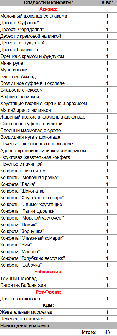 Молочный шоколад со злаками (1 шт), Десерт "Суфаэль" (1 шт), Десерт "Фараделла" (1 шт), Десерт с кремовой начинкой (1 шт), Десерт со сгущенкой (1 шт), Десерт Ломтишка (1 шт), Орешка с кремом и фундуком (1 шт), Мини-рулет (1 шт), Мультизлаки (1 шт), Батончик Акконд (1 шт), Воздушное суфле в шоколаде (1 шт), Сладость с кокосом (1 шт), Вафли с начинкой (1 шт), Хрустящие вафли с карам-ю и арахисом (1 шт), Мягкий ирис с начинкой (1 шт), Жареный арахис и карамель в шоколаде (1 шт), Cливочное суфле с начинкой (1 шт), Слоеный мармелад с суфле (1 шт), Воздушная нуга в шоколаде (1 шт), Печенье с карамелью в шоколаде (1 шт), Адель с кремовой начинкой и миндалем (1 шт), Фруктовая жевательная конфета (1 шт), Печенье с начинкой (1 шт), Конфета с бисквитом (1 шт), Темный шоколад (1 шт), Батончик Бабаевский (1 шт), Драже в шоколаде (1 шт), Жевательный мармелад (1 шт), Леденец на палочке (1 шт)