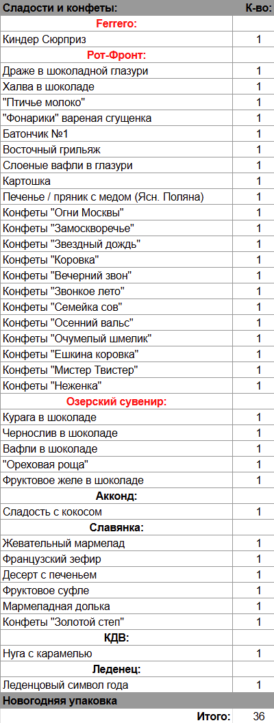 Киндер Сюрприз (1 шт), Драже в шоколадной глазури (1 шт), Халва в шоколаде (1 шт), "Птичье молоко" (1 шт), "Фонарики" вареная сгущенка (1 шт), Батончик №1 (1 шт), Восточный грильяж (1 шт) , Слоеные вафли в глазури (1 шт), Картошка (1 шт), Печенье / пряник с медом (1 шт), Курага в шоколаде (1 шт), Чернослив в шоколаде (1 шт), Вафли в шоколаде (1 шт), "Ореховая роща" (1 шт), Фруктовое желе в шоколаде (1 шт), Жевательный мармелад (1 шт), Сладость с кокосом (1 шт), Французский зефир (1 шт), Десерт с печеньем (1 шт), Фруктовое суфле (1 шт), Мармеладная долька (1 шт), Нуга с карамелью (1 шт), Леденцовый символ года (1 шт)
