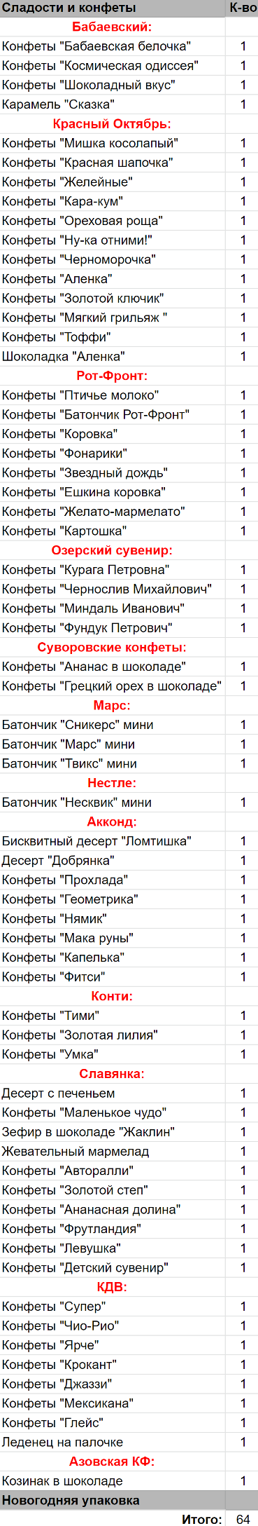 Кол-во сладостей: 63 шт.