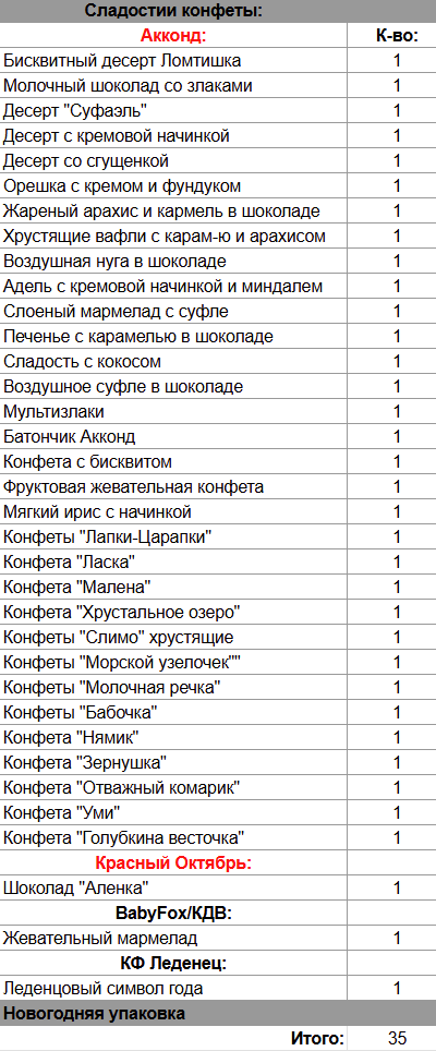 Бисквитный десерт Ломтишка (1 шт), Молочный шоколад со злаками (1 шт), Десерт "Суфаэль" (1 шт), Десерт с кремовой начинкой (1 шт), Десерт со сгущенкой (1 шт), Орешка с кремом и фундуком (1 шт), Жареный арахис и кармель в шоколаде (1 шт), Хрустящие вафли с карам-ю и арахисом (1 шт), Воздушная нуга в шоколаде (1 шт), Адель с кремовой начинкой и миндалем (1 шт), Слоеный мармелад с суфле (1 шт), Печенье с карамелью в шоколаде (1 шт), Сладость с кокосом (1 шт), Воздушное суфле в шоколаде (1 шт), Мультизлаки (1 шт), Батончик Акконд (1 шт), Конфета с бисквитом (1 шт), Фруктовая жевательная конфета (1 шт), Мягкий ирис с начинкой (1 шт), Жевательный мармелад (1 шт), Шоколад "Аленка" (1 шт), Леденцовый символ года (1 шт)